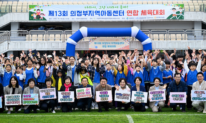 의정부 종합운동장에서 경기 의정부시 지역아동센터연합회 희망사다리가 ‘제13회 의정부시 지역아동센터 연합체육대회’를 개최했다. 사진은 대회에 참석한 김동근 시장이 참여자들과 기념 촬영을 하는 모습. (사진=의정부시청 제공)