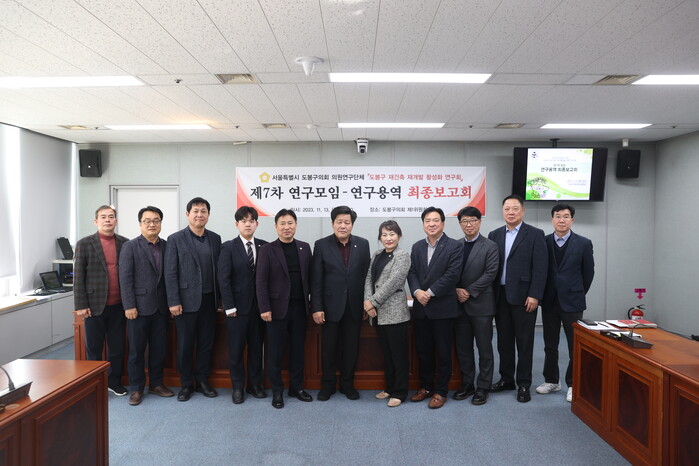 [시민일보 = 여영준 기자] 서울 도봉구의회(의장 강신만)가 최근 구의회 제1위원회실에서 연구단체 의원들과 도봉구청 재건축재개발과장을 비롯한 재건축팀장과 재개발팀장, 한국응용통계연구원 연구위원 2명이 참석한 가운데 최종보고회를 개최했다.