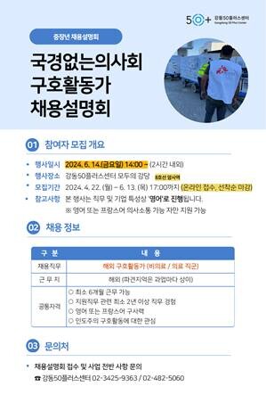 강동50플러스센터와 ‘국경없는의사회 한국지사’가 함께하는 이번 설명회에서는 채용담당자로부터 구호활동가의 지원 자격, 근무 조건, 채용 절차 등의 정보를 제공받을 수 있다.