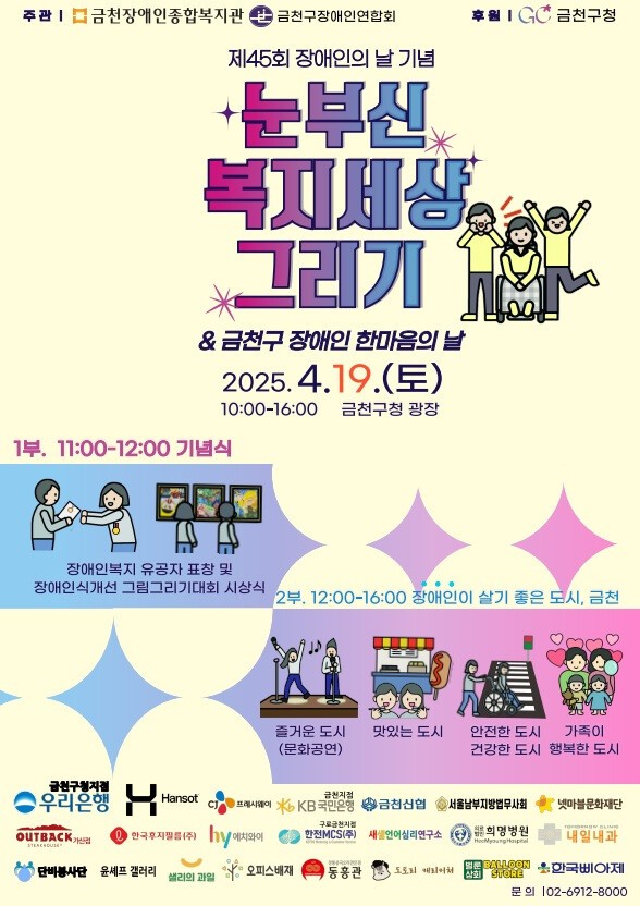 [시민일보 = 여영준 기자] 서울 금천구(구청장 유성훈)는 오는 19일 오전 10시~오후 4시 구청 광장에서 제45회 장애인의 날을 맞아 ‘눈부신 복지세상 그리기’ 및 ‘금천구 장애인 한마음의 날’ 행사를 개최한다고 밝혔다.