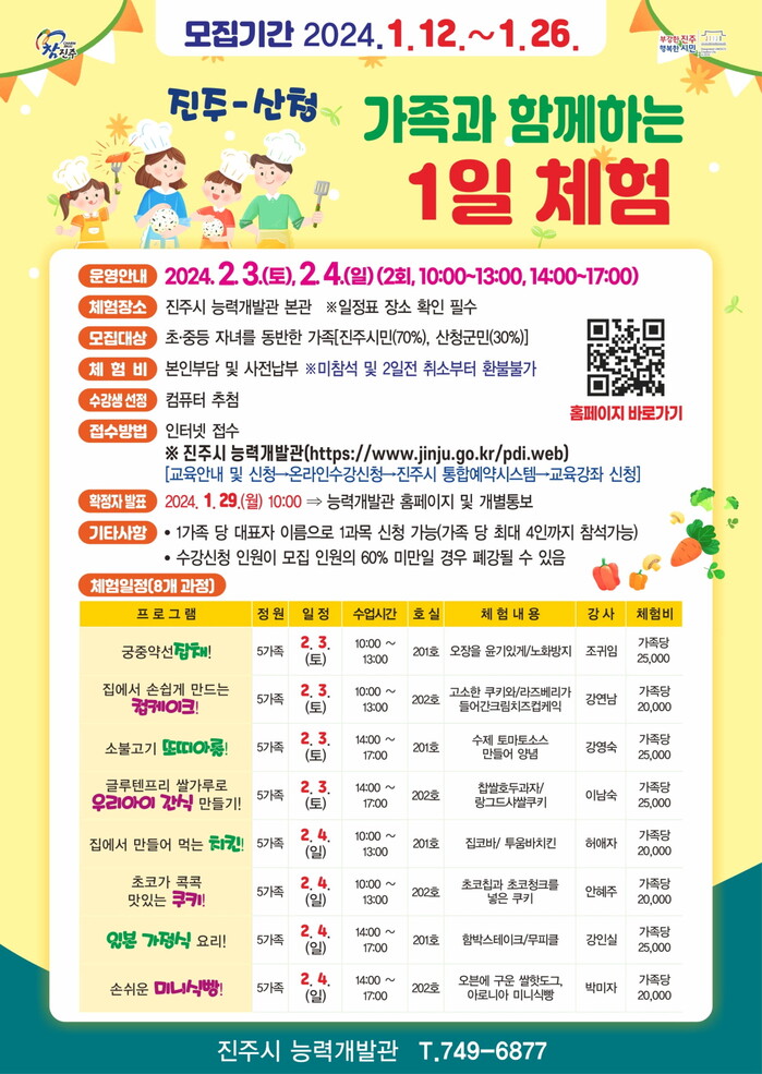 이번 체험행사는 8개 프로그램별 5가족씩 모집하여 진주·산청 지역 40가족 160여 명이 참여하게 되며 오는 2월 3일 토요일과 4일 일요일 오전 10시부터 오후 1시, 오후 2시부터 5시까지 운영한다. ‘집에서 손쉽게 만드는 컵케이크!’, ‘초코가 콕콕 맛있는 쿠키’등 전문 강사의 지도하에 진행할 예정이다.
