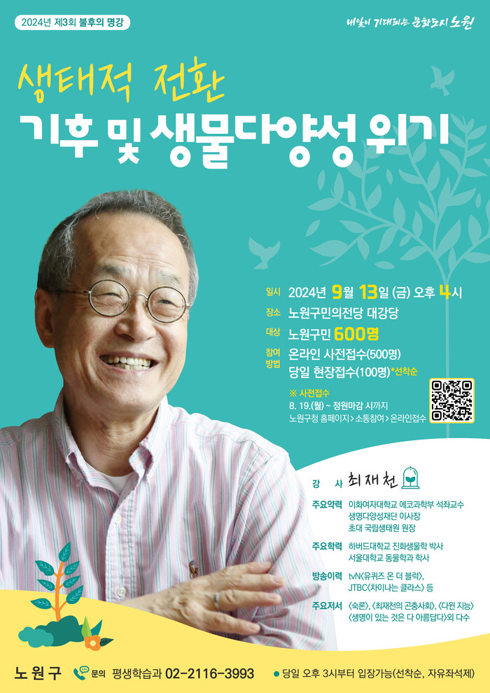 오승록 구청장은 “기후변화를 넘어 기후위기에 직면한 현재 탄소중립 시대를 선도하는 노원에 가장 필요한 지혜를 얻기 위해 최재천 교수를 모셨다”며, “많은 구민들이 생태적 전환에 대해 깊이 고민하고 함께 실천할 수 있는 계기가 되길 바란다”고 밝혔다.