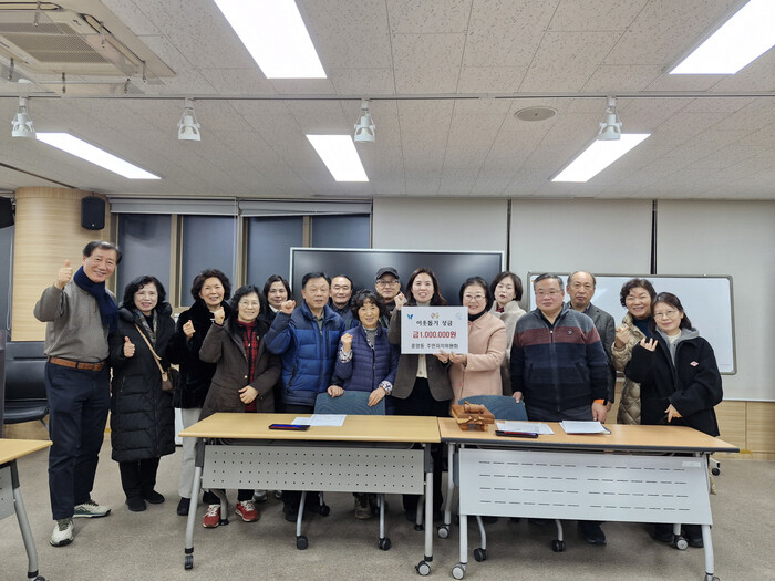 경기 과천시 중앙동은 지역내 어려운 이웃을 돕기 위해 불우이웃돕기 성금 100만원을 중앙동 주민자치위원회로부터 기부받았다. 이번 성금은 지역내 취약계층을 지원하는 데 사용될 예정이다. 사진은 전달식에서 관계자들이 기념 촬영을 하는 모습. (사진=과천시청 제공)