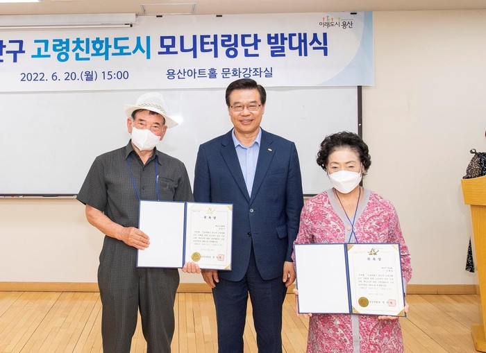 서울 용산구가 지난 20일 ‘고령친화도시 어르신 모니터링단’ 2기 발대식을 개최했다. 발대식은 2기 어르신 모니터링단 위촉장 수여, 격려사, 기념촬영, 실무교육, 분과 구성 회의 순으로 1시간 동안 진행됐다. 사진은 성장현 구청장(가운데)이 위촉장 대표 수여자 2명과 기념촬영을 하는 모습. (사진제공=용산구청)