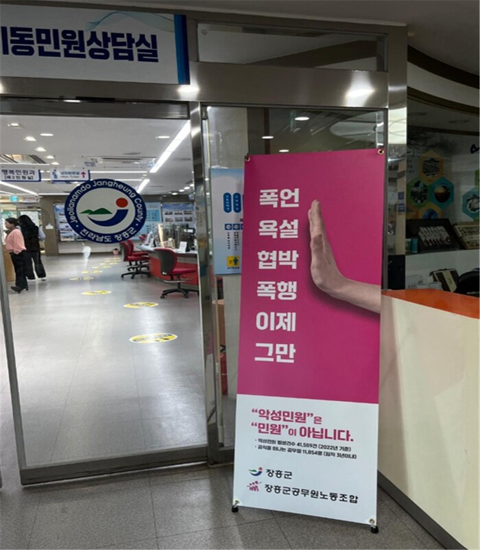이에 발맞춰 군과 장흥군노동조합은 직원 보호를 위한 첫걸음으로 악성 민원 근절 베너를 설치했다.