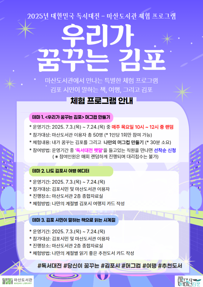 [김포=문찬식 기자] 경기 김포시 마산도서관이 올해 대한민국 독서대전 개최를 기념해 3일부터 24일까지 '우리가 꿈꾸는 김포'라는 체험 프로그램을 운영한다.