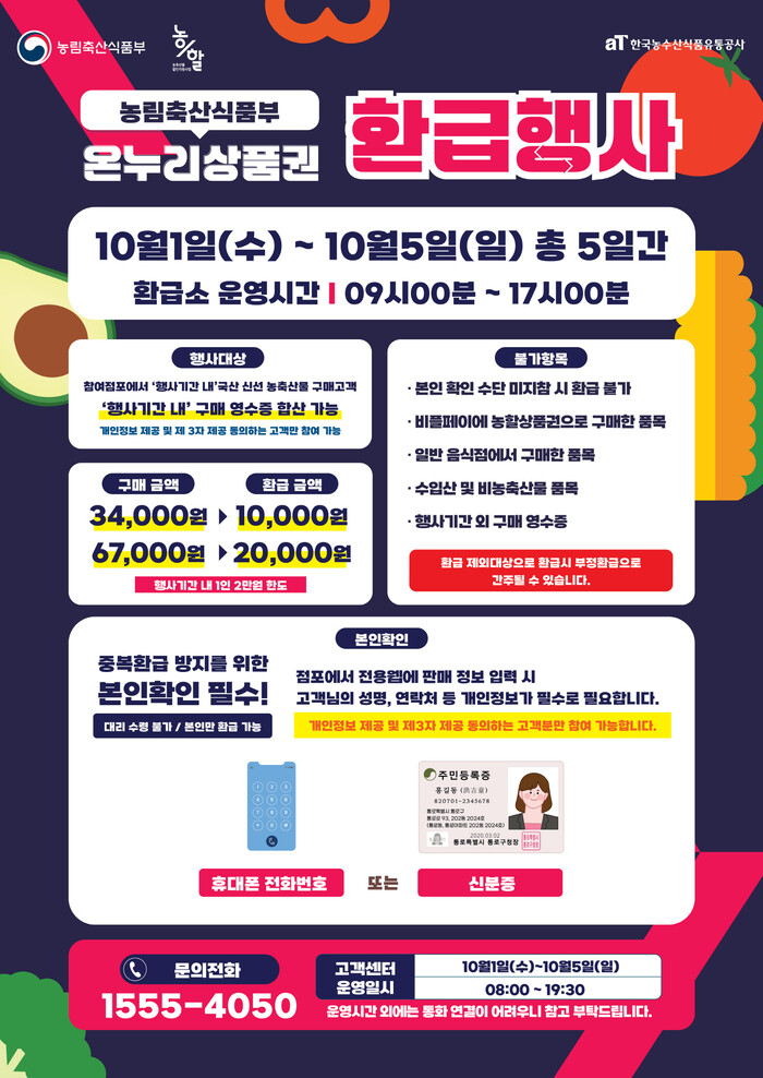 행사 기간 중 참여 점포에서 국산 신선 농축산물 또는 수산물을 구매한 소비자는 구매 금액의 최대 30%를 온누리상품권으로 환급받을 수 있다. 품목별(농축산물, 수산물)로 1인당 각각 2만 원까지 환급이 가능해, 두 부문을 모두 이용하면 최대 4만 원의 혜택을 받을 수 있다. 환급 금액은 ▲3만 4000원 이상~6만 7000원 미만 구매 시 1만 원, ▲6만 7000원 이상 구매 시 2만 원이다.