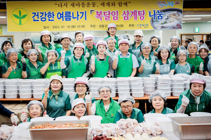 서울 강동구 새마을부녀회는 최근 ‘복달임 삼계탕 나눔’ 행사를 개최했다. 이번 행사는 (주)세스코에서 300만원 후원을 받아 취약계층 330가구의 건강을 위한 삼계탕을 만들어 전달했다. 사진은 봉사자들이 기념촬영을 하고 있는 모습. (사진=강동구청 제공)