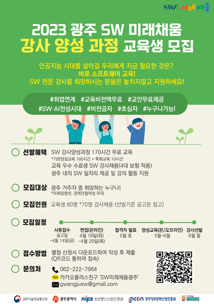 자세한 내용은 시 홈페이지(시정소식·공지사항)에서 확인할 수 있으며, 소프트웨어 미래채움 관련 문의사항은 소프트웨어 미래채움 광주센터로 하면 된다.