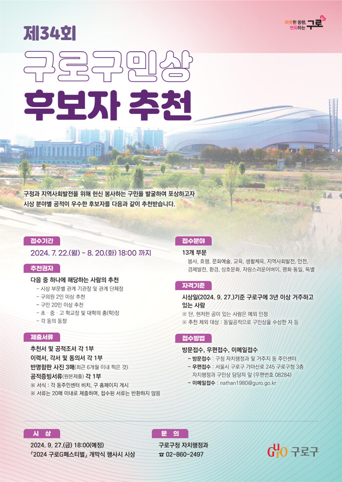 [시민일보 = 이대우 기자] 서울 구로구(구청장 문헌일)가 ‘제34회 구로구민상’ 후보자를 오는 8월20일까지 공모한다.