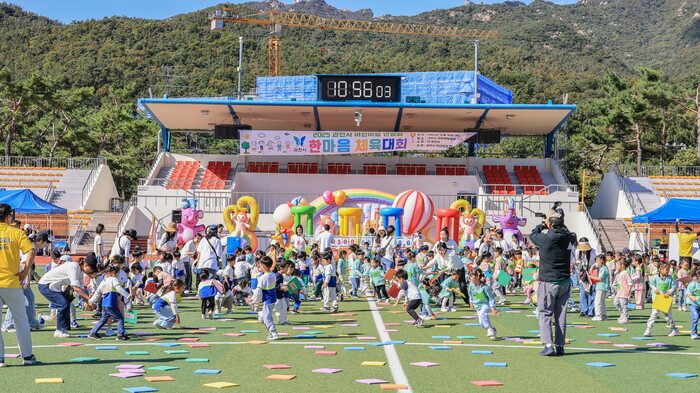 경기 과천시 관문체육공원에서 최근 지역내 어린이집 영유아와 보육교직원 등 2000여명이 참여한 ‘어린이집 한마음 체육대회’가 개최됐다. 이번 행사는 과천시어린이집연합회 주관으로 마련됐다. 사진은 어린이들이 대회에 참여하는 모습. (사진=과천시청 제공)