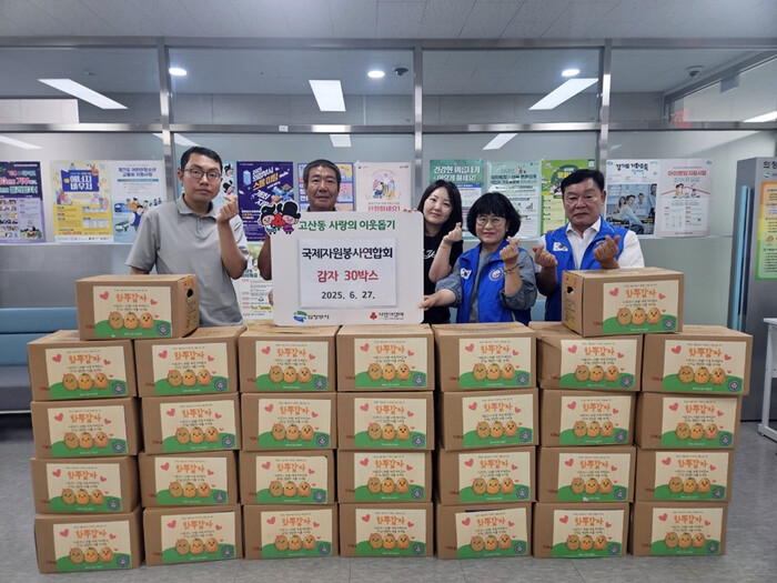 경기 의정부시 고산동 주민센터가 최근 (사)국제자원봉사연합회로부터 직접 수확한 햇감자 30상자(10kg 단위)를 기부받았다. 사진은 기탁식에서 관계자들이 기념 촬영을 하는 모습. (사진=의정부시청 제공)