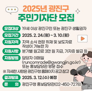 [시민일보 = 여영준 기자] 서울 광진구(구청장 김경호)는 주민이 지역사회의 소식을 발굴해 전달하는 ‘2025 주민기자단’을 오는 3월10일까지 모집한다고 26일 밝혔다.