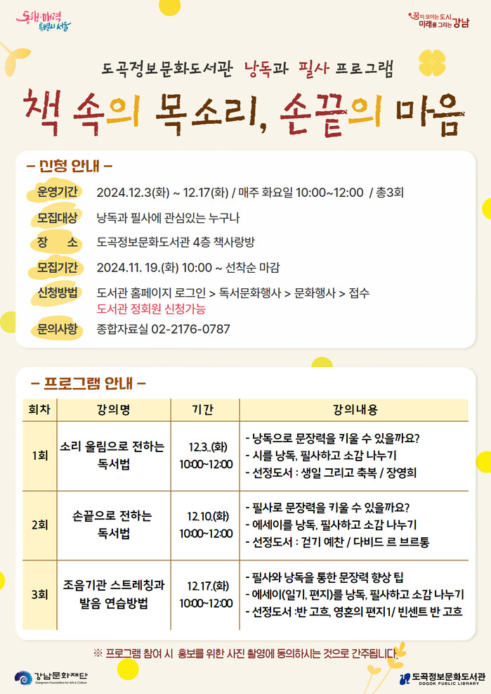 [시민일보 = 이대우 기자] 강남문화재단(이사장 이자연)에서 운영하는 도곡정보문화도서관은 오는 12월 3일(화)부터 12월 17일(화)까지 매주 화요일마다 도서 낭독과 필사 프로그램 <책 속의 목소리, 손끝의 마음>을 운영한다.