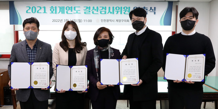 [인천=문찬식 기자] 인천 계양구의회가 최근 의장실에서 2021회계연도 세입·세출 결산검사를 실시할 위원들에게 위촉장을 수여했다.
