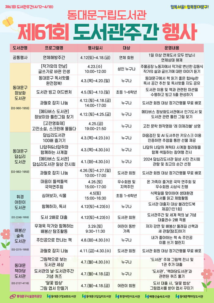 [시민일보 = 이대우 기자] 동대문구립도서관(동대문구정보화도서관, 동대문구답십리도서관, 휘경어린이도서관, 배봉산숲속도서관, 동대문책마당도서관)은 도서관의 날(4월 12일) 및 제61회 ‘도서관 주간(4월 12일~18일)’을 맞아 4월 한 달간 다양한 독서 문화 행사를 펼친다.