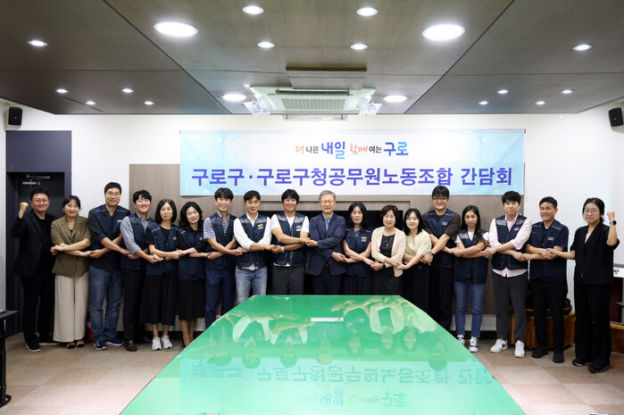 서울 구로구가 15일 구청 르네상스홀에서 구로구청 공무원노동조합과 간담회를 열고 소통의 시간을 보냈다. 사진은 장인홍 구청장(사진 왼쪽 열 번째)과 공무원노동조합이 단체 기념 촬영을 하는 모습. (사진=구로구청 제공)