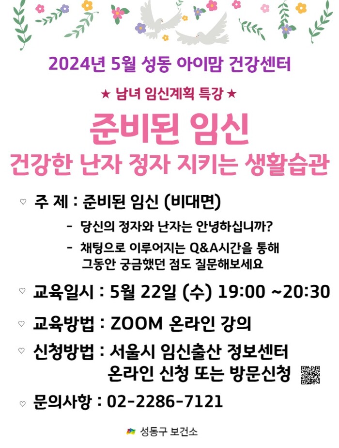 [시민일보 = 변은선 기자] 서울 성동구(구청장 정원오)는 신혼부부 또는 예비부모를 대상으로 ‘준비된 임신’에 대한 주제로 22일 특강을 한다고 밝혔다.