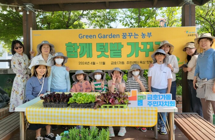 서울 성동구 금호1가동 주민자치회가 2024년 주민주도형 사업을 본격 운영하고 있다. 사진은 금호아이꿈누리터 아이들과 함께 금호1가동 그린가든 사업의 하나인 '꿈꾸는 농부' 발대식을 진행하고 기념촬영을 하고 있는 모습. (사진=성동구청 제공)