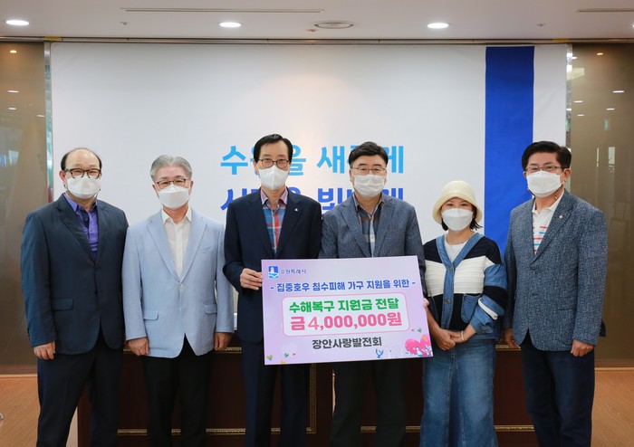 경기 수원시 장안구는 최근 봉사단체인 ‘장안사랑발전회’로부터 수해복구 지원금 및 장안구 여성축구단, 여성합창단 등 지역발전을 위한 후원금 총 800만원을 전달받았다. 사진은 전달식에서 최상규 구청장(오른쪽 세 번째)과 관계자들이 기념촬영을 하는 모습. (사진제공=장안구청)