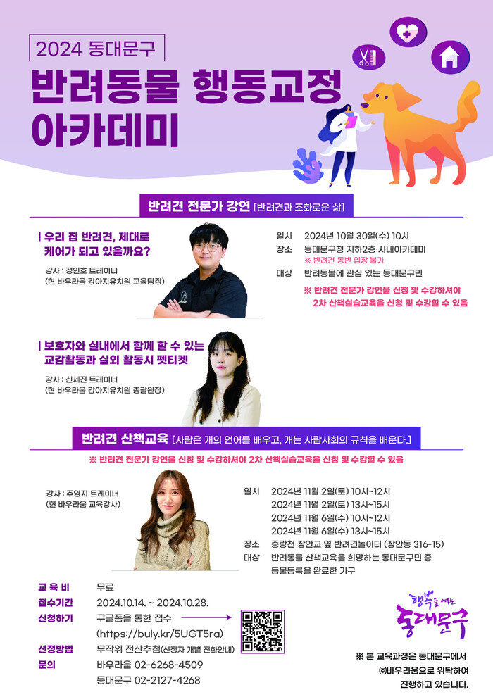 [시민일보 = 이대우 기자] 동대문구(구청장 이필형)는 성숙한 반려문화를 조성하기 위해 '반려견 행동교정 아카데미'를 운영한다.