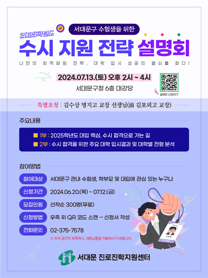 아울러 ‘서대문 진로진학지원센터’(수색로 43, 4층)에서는 이번 설명회 직후부터 수시 원서 접수가 있는 9월 중순까지 약 2달 동안 지역내 수험생을 위한 ‘수시 합격 집중 컨설팅’을 진행한다.