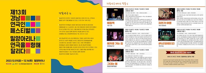 [밀양=최성일 기자] 밀양시는 오는 12월 1일부터 16일까지 공연예술극장 밀양아리나에서 제13회 경남연극인 페스티벌을 개최한다고 밝혔다.