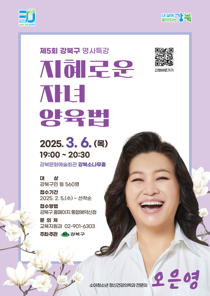 이번 특강은 구민 560여명을 대상으로 오후 7시~8시30분 진행된다. 초청 강연자인 오은영 박사는 소아·청소년 정신의학과 전문의로, ‘오은영 리포트’, ‘요즘 육아 금쪽같은 내 새끼’ 등 다양한 방송 프로그램에 출연하며 부모 교육 및 심리 상담 분야에서 활발히 활동하고 있다.