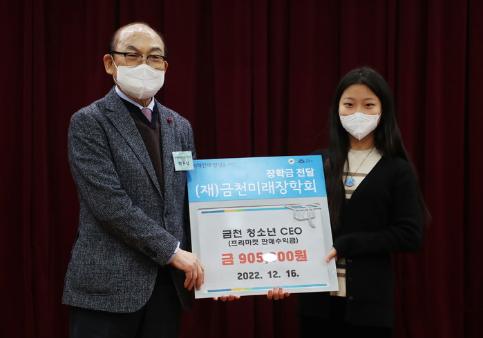 [시민일보 = 여영준 기자] 서울 금천구(구청장 유성훈)는 최근 ‘청소년CEO 프로젝트’에 참여한 청소년들이 창업 아이템을 판매한 수익금 90만5000원을 금천미래장학회에 기탁했다고 20일 밝혔다.