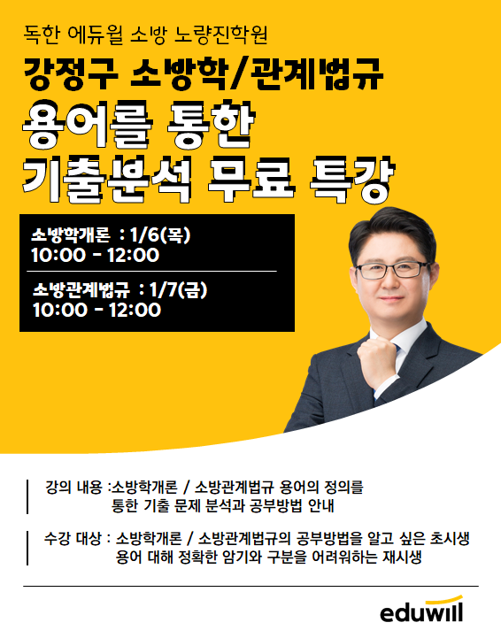 이번 특강에서는 소방학개론 용어의 구분과 암기법을 정리할 예정이며, 시험에서 1문제 이상 출제되는 용어의 정의에 대한 정확한 구분법을 강의한다는 에듀윌의 설명이다.