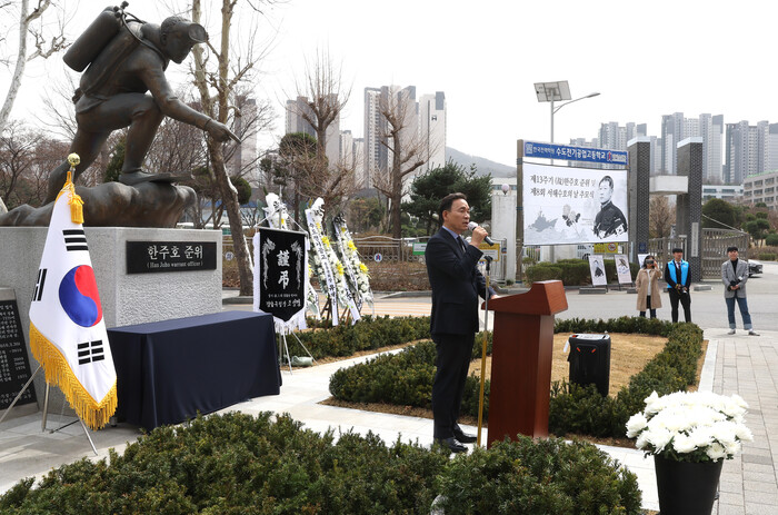 18일 구에 따르면 지난해 3월24일에 열린 추모식에 참석한 조성명 구청장이 “한주호 준위 동상이 있는 기념공원을 지속적으로 관리하고, 뜻깊은 추모공간으로 자리매김할 수 있도록 지원하겠다”는 취지를 밝히며 올해부터 강남구에서 기념식을 주관한다.