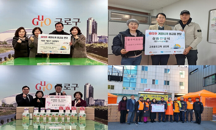 | ▲ 2025 따뜻한 겨울나기 성금, 성품 전달식(왼쪽 위부터 개봉체육관 웰빙댄스 일동, 그라운드고척 상인회, 우리아이들병원, 구로소방서). (사진=구로구청 제공) |
