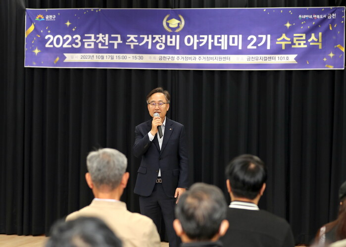 서울 금천구는 최근 ‘2023 금천구 주거정비 아카데미’ 2기 수료식을 개최했다. 사진은 유성훈 구청장이 주거정비 아카데미를 수료한 주민들에게 인사말을 하고 있는 모습. (사진=금천구청 제공)