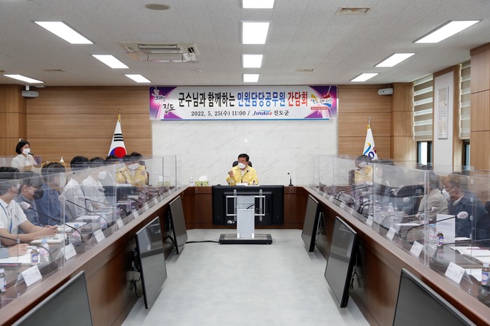 전남 진도군이 지난 25일 군청 회의실에서 대민 행정서비스를 처리하는 민원담당 공무원들의 고충과 건의사항, 민원 현안에 대한 자유로운 대화의 장을 열기 위한 '군수님과 함께하는 민원담당 공무원 간담회'를 개최했다. 사진은 이동진 군수가 이날 간담회를 주재하고 있는 모습. (사진제공=진도군청)