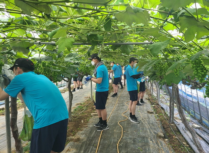 경기 수원시 권선구는 영농기를 맞아 지역내 포도 재배농가 일손 부족 해소를 위해 공군 제10전투비행단의 지원을 받아 오는 7월5일까지 3주간 지역내 포도농장에서 일손 돕기에 나섰다. 사진은 지난 20일 공군장병들이 포도봉지 씌우기 작업을 하고 있는 모습. (사진제공=권선구청)