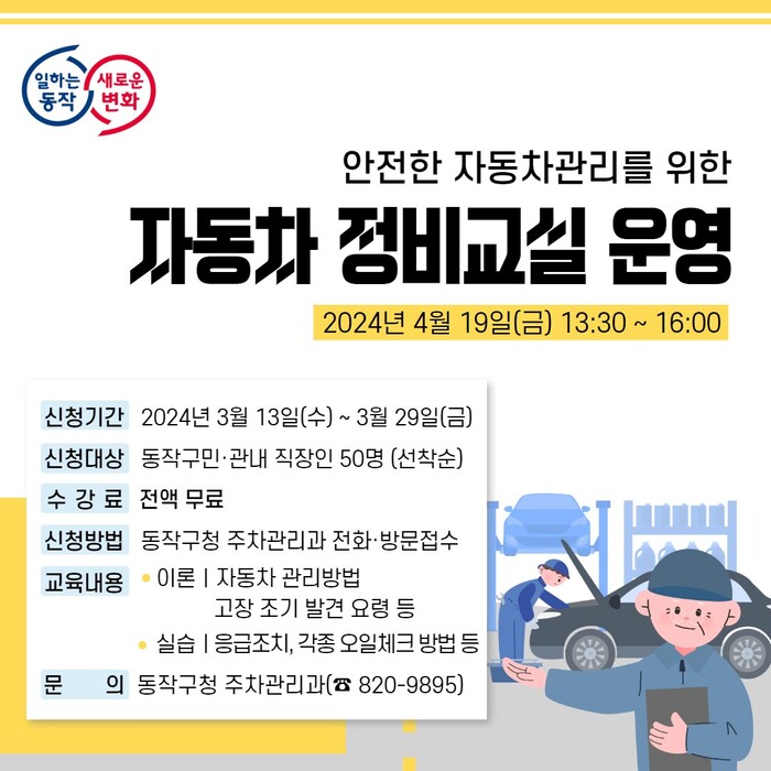 [시민일보 = 여영준 기자] 서울 동작구(구청장 박일하)는 자가운전자의 안전한 자동차 관리를 돕고자 오는 4월19일 구청에서 자동차 정비교실을 운영한다고 밝혔다.