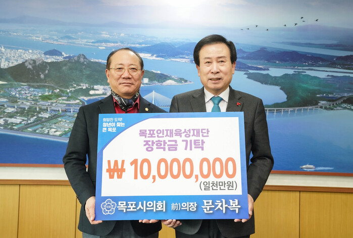 | ▲ 문차복 의원(전반기 의장)이 목포인재육성재단에 장학금 1000만원을 기부했다.(출처=문차복 의원실) |