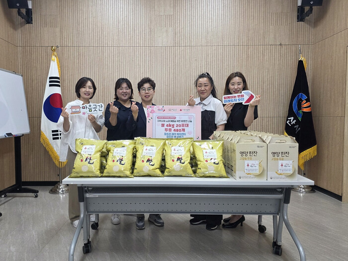 경기 오산시 대원2동 행정복지센터가 15일 참조은 재가복지센터와 참조은 애 의료기로부터 쌀 80kg(4kg 20포대)과 두유 480개를 기탁받았다. 사진은 기탁식에서 관계자들이 기념 촬영을 하는 모습. (사진=오산시청 제공)