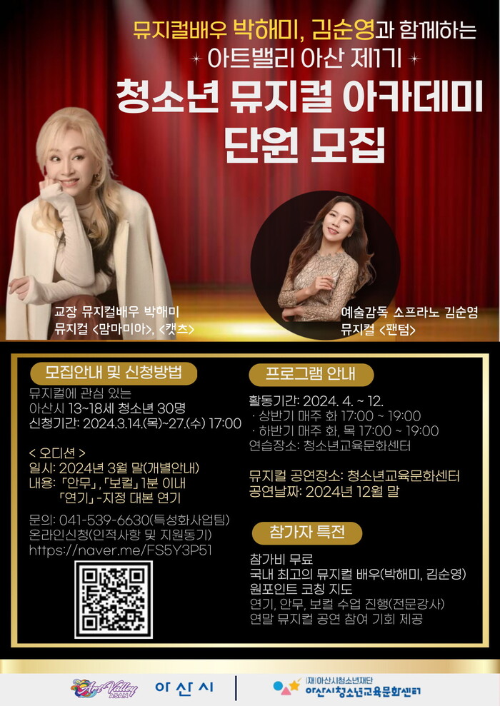 충남 아산시가 오는 27일까지 뮤지컬 배우 박해미와 소프라노 김순영이 함께 하는 ‘아트밸리 아산 제1기 청소년 뮤지컬 아카데미’에 참여할 아산시 13~18세 청소년 단원(30명)을 모집한다.