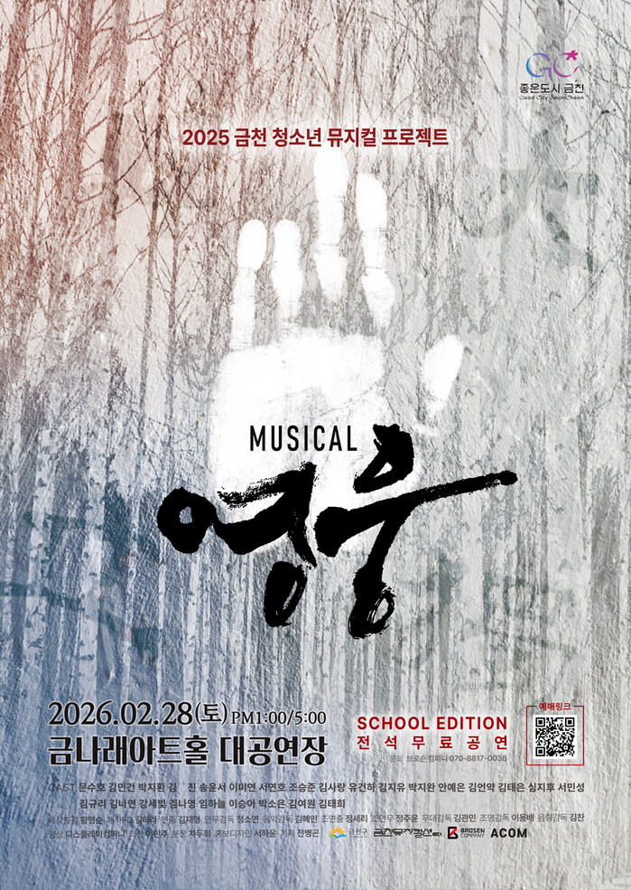 [시민일보 = 여영준 기자] 서울 금천구(구청장 유성훈)는 금천 청소년 뮤지컬 프로젝트 ‘영웅’이 오는 28일 금나래아트홀 대공연장에서 개최된다고 23일 밝혔다.