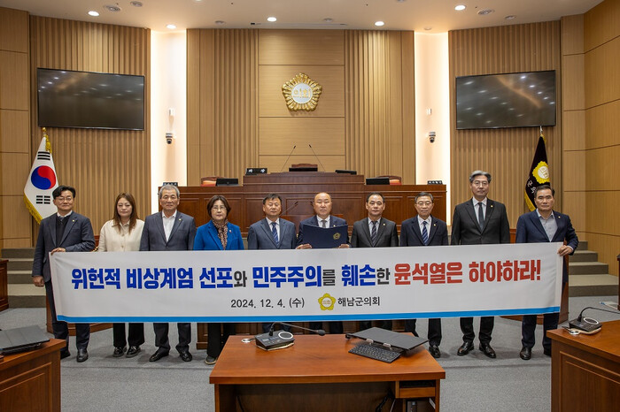 해남군의회 전체 의원은“대한민국의 주권은 국민에게 있고 모든 권력은 국민으로부터 나온다. 지금의 상황이 ‘헌법’이 말하는 전시·사변 또는 이에 준하는 국가 비상 상태인지 우리는 반박할 필요성도 느끼지 못하고 있다”면서, “이에 해남군의회는 대통령의 비민주적 계엄 선포는 실체적·절차적으로 모두 위헌임을 각인하며, 윤석열은 즉각 하야할 것”을 강력히 촉구했다. 또한“해남군의회는 앞으로도 해남군민의 뜻을 대변하고 함께 할 것임을 다시 한 번 약속한다”고 덧붙였다.