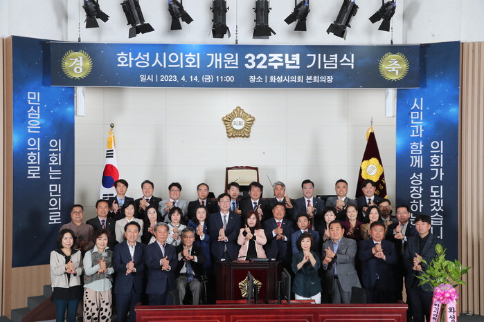 1991년 4월15일 개원해 올해 개원 32주년을 맞는 시의회는 이날 김경희 의장을 비롯한 화성시의원, 의정회 임원, 정명근 화성시장, 집행부 및 의회 직원 등 80여 명이 참석한 가운데 기념식을 진행했다.