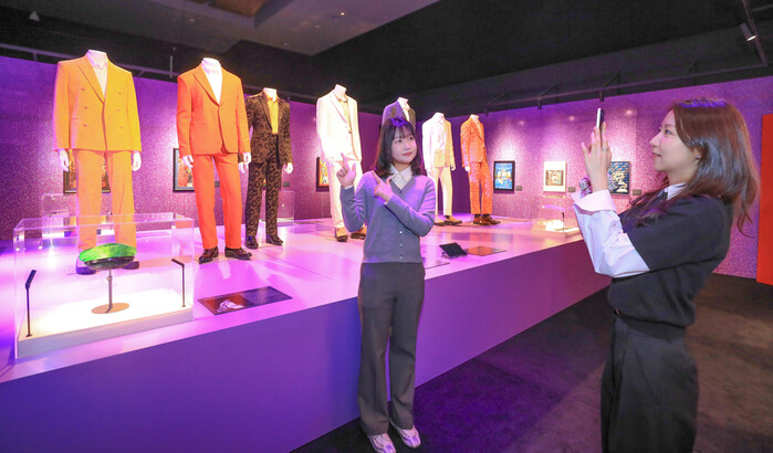| ▲ 18일 오전, 서울 강남구에 위치한 현대백화점 무역센터점 10층 문화홀에서 열린 '위대한 뮤지션 100인전 vol.1' 전시에서 고객들이 방탄소년단 무대의상 앞에서 기념사진을 찍고 있다. (사진=현대백화점 제공) |