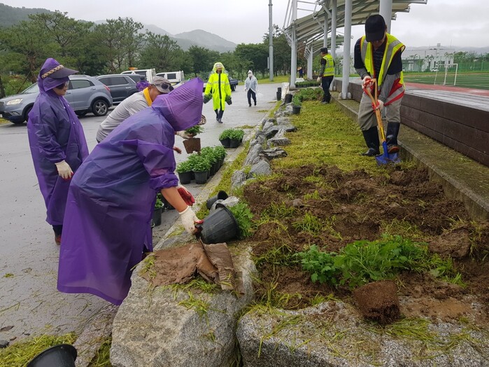 경기 양평군 양서면 국화축제추진위원회와 새마을회는 최근 국수생활체육공원 일대에 다년생 국화 2000여주를 심었다. 사진은 이날 봉사자들이 국화를 심고 있는 모습. (사진=양평군청 제공)