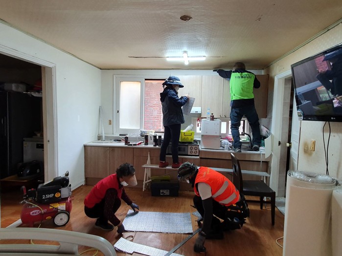 경기 포천시 일동면 행정복지센터는 최근 사례관리 대상 가구의 열악한 주거환경 개선을 위해 일동동부교회 디딤돌봉사단과 명예 사회복지공무원, 포천시자원봉사센터, 대박전기와 함께 주거환경개선 사업을 시행해 도배·장판·전등을 교체했다. 사진은 이날 봉사자들이 도배를 하고 있는 모습. (사진제공=포천시청)