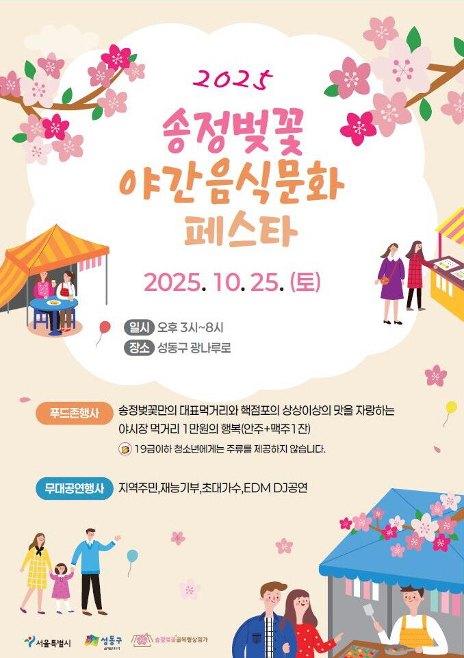 ‘2025 송정벚꽃야간음식문화페스타’가 오는 25일 오후 3시부터 8시까지, 성동구 광나루로길 일대(송정벚꽃골목형상점가)에서 펼쳐진다.