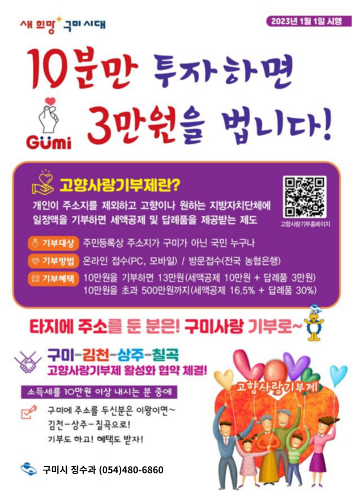 [구미=박병상 기자] 경북 구미시가 고향사랑기부제 활성화와 건전한 기부문화 확산을 위해 '고향사랑기부 감사 이벤트'를 실시했다.