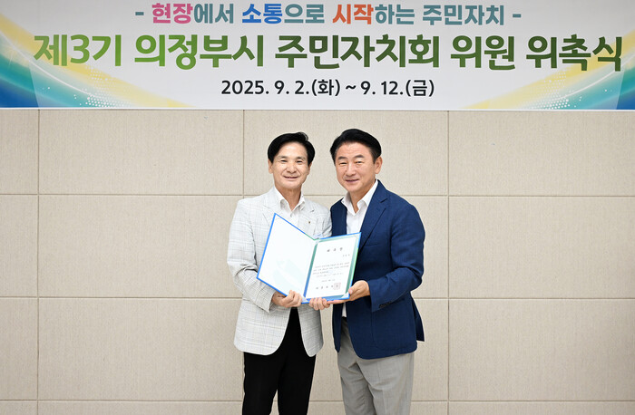 경기 의정부시 고산동 주민센터가 최근 제3기 주민자치위원 위촉식을 개최했다. 사진은 김동근 시장(오른쪽)이 자치회 위원에게 위촉장을 전달한 뒤 기념 촬영을 하는 모습. (사진=의정부시청 제공)