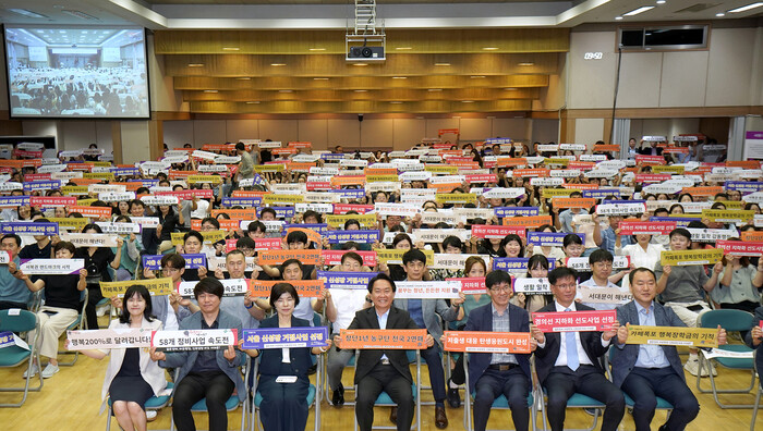 | ▲ 민선 8기 하반기 첫날인 1일 구청 6층 대강당에서 열린 직원 정례조례에서 이성헌 구청장(앞줄 가운데)이 직원들과 함께 구정 비전과 목표를 담은 손팻말을 들고 있다. (사진=서대문구청 제공) |