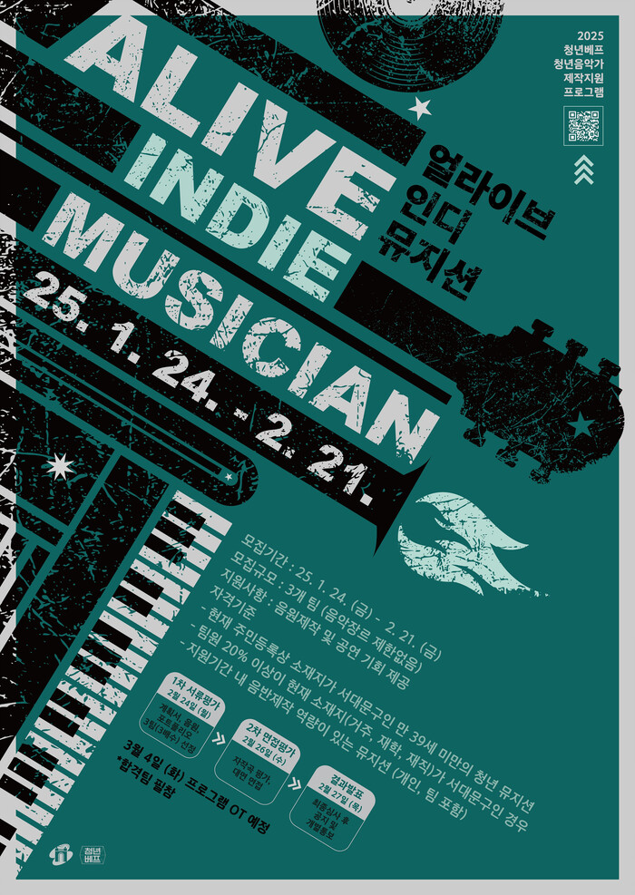 [시민일보 = 이대우 기자] 서대문구(구청장 이성헌)가 지역 청년 인디음악가들의 성장을 지원하기 위해 2025년 상반기 음원제작지원 프로그램 ‘얼라이브 인디뮤지션’ 청년 아티스트를 모집한다.